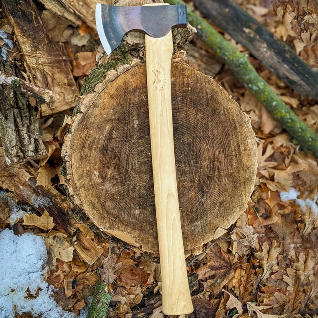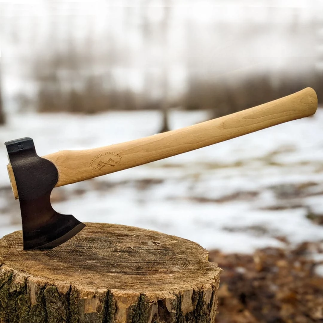 1.7 lbs. Wood-Craft Camp Carver, 22 in. Straight Handle, with a high quality Leather Mask: The Council Tool Co.’s WOOD-CRAFT Camp Carver is designed to be a multi-use bushcraft/camping axe, and a carving axe for fine woodworking. The design has its heritage in the larger riggers axes of North America, the bearded axes of Northern Europe. It’s a carver (bushcraft axe) that you don’t have to worry about bringing into the woods with you, or letting it get dirty while doing camp-chores. With a swept toe, flat-grind, large bit length, bearded blade, and a radius under the hammer poll for the web of the user’s hand, it was made to choke up, shave, and do detailed work. The poll is hardened and can be used like a hammer. It helps with balance of the head overall, and gives leverage when choking up. It has a 90 deg. spine for scraping tinder and for using a ferro-rod to start fires in a pinch, or just for fun. The handle is straight for one or two handed use and can be cut to a custom size with a large hatchet eye to provide strength/durability, and a comfortable grip when choking up. The axe will be a good tool for carvers, bushcrafters, green-woodworkers, trappers, hunters, backpackers, day-hikers, off-road bikers, campers, paddlers, tradesmen, ranchers, homesteaders, hobbyists and collectors. It can be worn on a belt, in a hammer/hatchet holster, in or on a pack, with a sling, in a go-bag, or in a tool box.