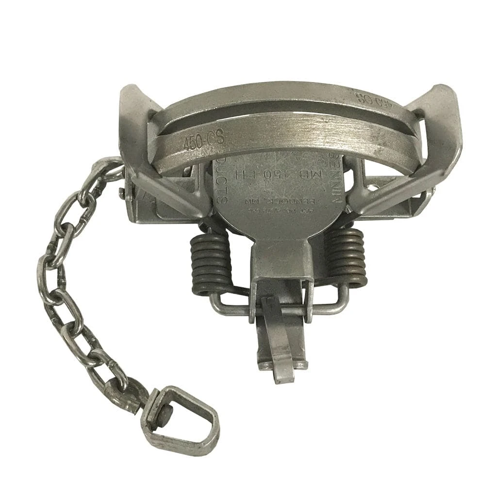 These are #1 1/2 size but built to hold bobcats and coyotes. The inside jaw spread is 4 3/8″, the outside spread is 5″. These traps feature 5/16″ thick cast jaws, Paws I Trip pan system, and a night-latched dog. They also have American made music wire springs, crunch proof swivels, and #2 US chain. Offset jaws.