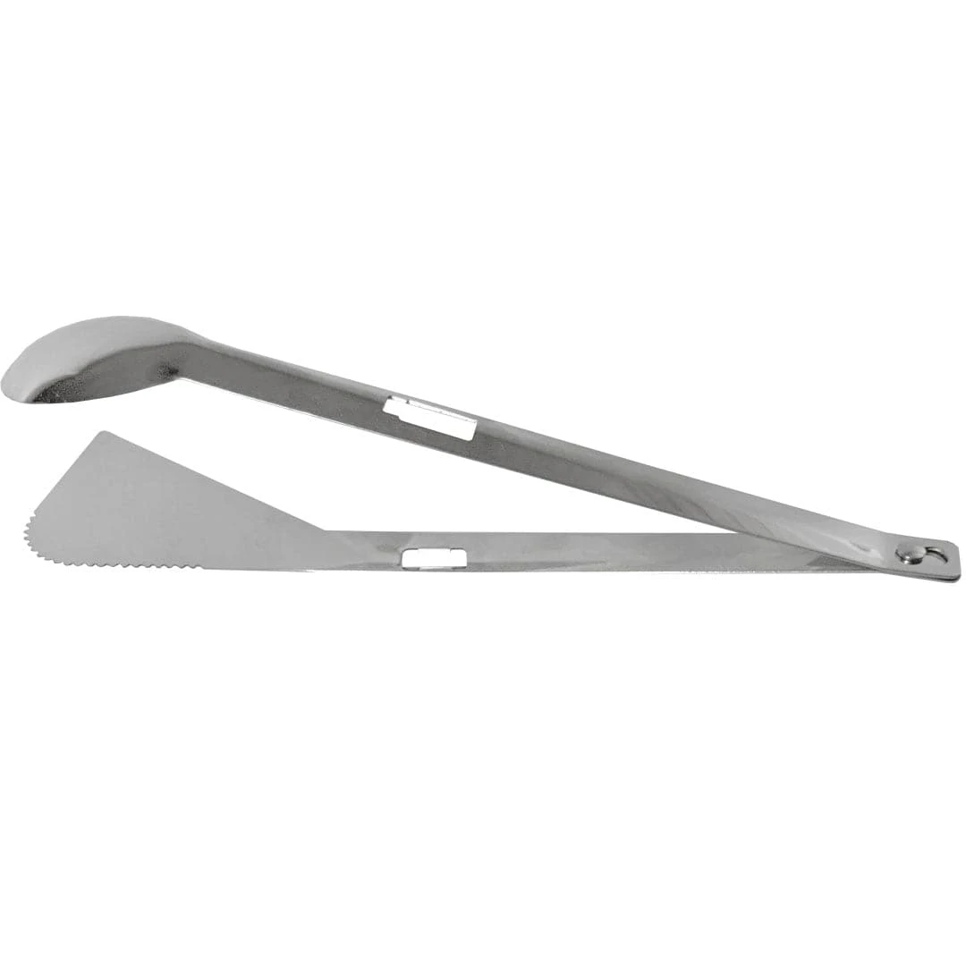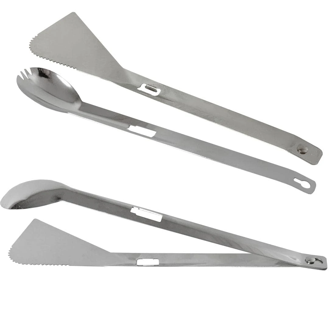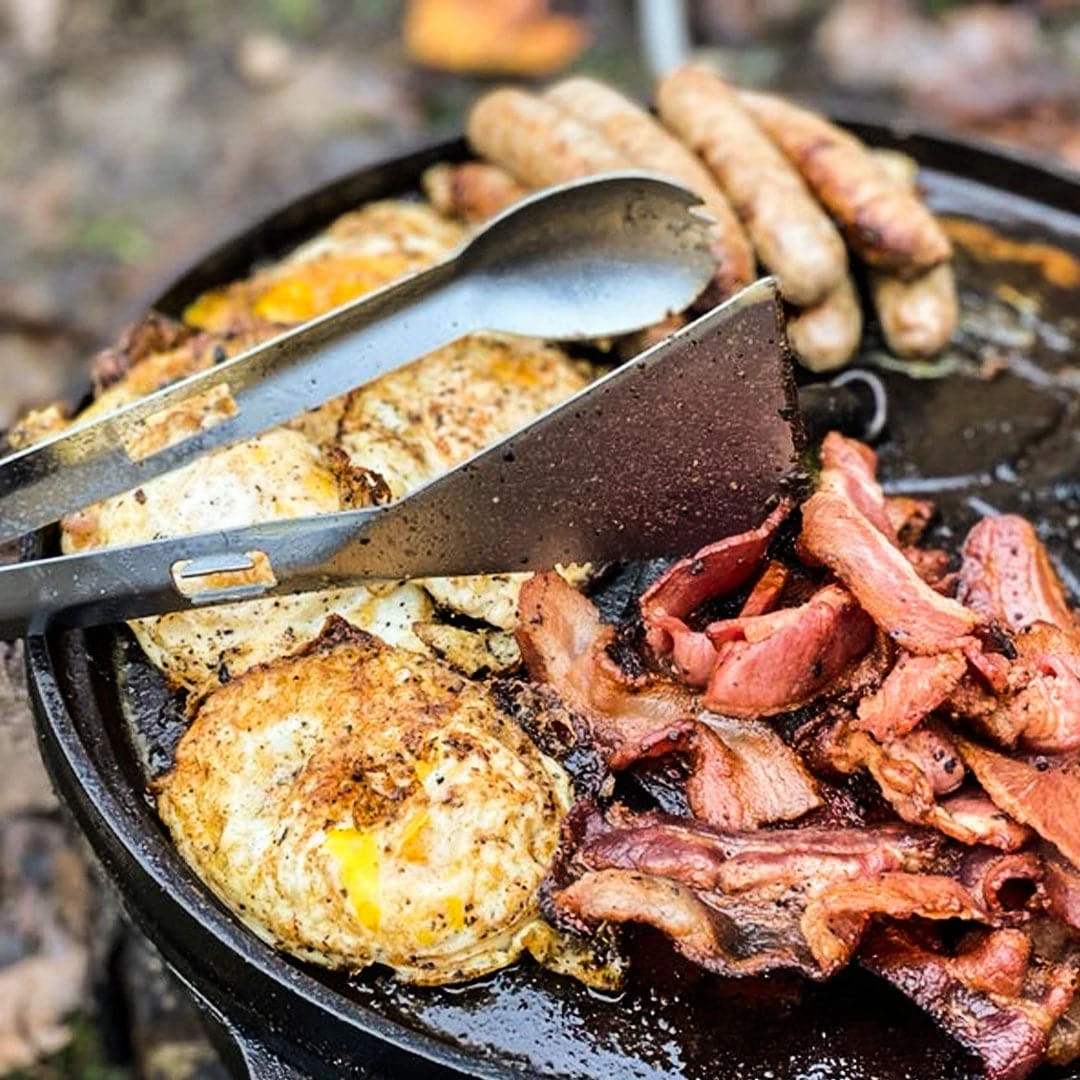 2 Pc. Stainless Steel Camp Tong Set. Just like items in a survival kit, multi-functional items are always a plus. These camp tongs provide several tools in one and are a great compliment to your camp cooking kit. You have a spatula, serving or mixing spoon, tongs for turning items and a fork when needed. The serrated edge of the spatula can be used as a meat tenderizer or bread knife. This all-in-one system is a must have for any camp cooking kit.